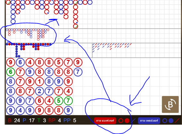สัญลักษณ์ด้านบน นั่นคือ จุดที่จะบอกว่า ถ้าตาม Bigeye สีแดง ต้องเล่น ในเค้าหลักให้เป็น Banker ถ้าต้องการเล่นให้เป็นน้ำเงินตัวต่อไป ก็ต้อง แทง Player Big eye คือคำทำนายอนาคตทั้ง 2 ฝั่ง ว่าถ้าอยากเล่นให้เป็นสีอะไร ต้องแทงฝั่งไหน นั่นเอง