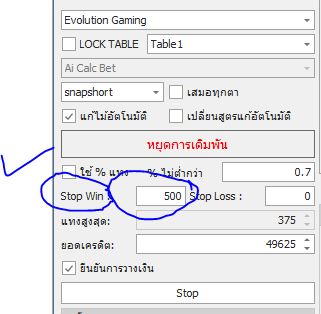 9. ถ้าท่านต้องการกำไร ทีละน้อยๆ ท่านก็สามารถ ตั้งค่าให้บอทหยุดวางเงินเมื่อถึงกำหนดได้ เช่นกันโดยตั้งค่า stop win หยุดเมื่อได้กำไร กี่บาท แล้วแต่ท่านจะกำหนด เช่นในรูป 500 ก็จะหยุดวางเงินเมื่อได้กำไรครบ 500 บาท